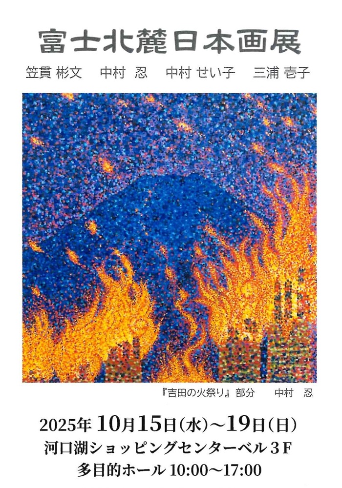 富士北麓日本画展を開催いたします。 富士北麓地域で活躍する日本画家の個性あふれる展示です。 入場無料。 この機会に是非お立ち寄りください。 開催日時 10月14日(火)~10月19日(日) 10:00~17:00 会 場 河口湖ショッピングセンターベル 3階 多目的ホール