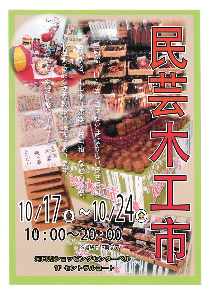 昔懐かしい民芸玩具、心温まる 紙風船、けんだま、こま 若狭塗箸、山中塗り漆器 美しい弁当箱 竹の日用品では ざる、巻き簾、竹べらなどその他、 檜、サワラ材などの一般民芸品を 多数取り揃えております。 ぜひ、お立ち寄りください。 開催日時 10月17日(金)~10月24日(金) 10:00~20:00 ※最終日は17:00まで 会 場 河口湖ショッピングセンターベル 1階 時計台広場